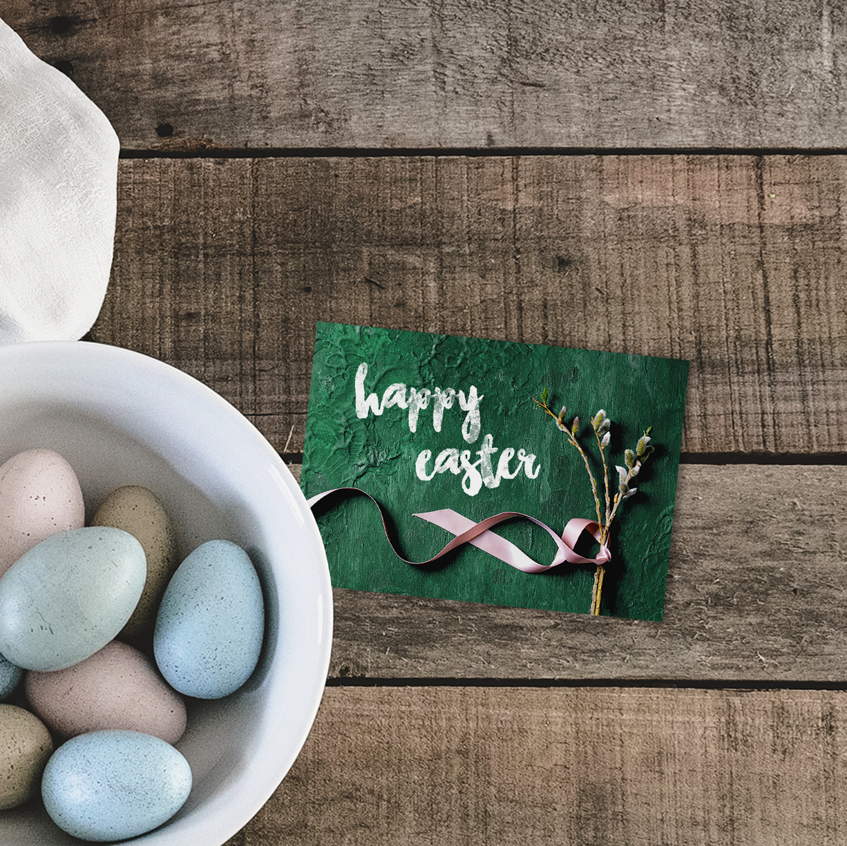 Eine stimmungsvolle Osterkarte mit natürlichen Grüntönen und einer zarten Weidenkätzchen-Illustration. Die moderne Typografie und das farbige Band machen sie zum idealen Begleiter für kleine Ostergeschenke, Osterkörbchen oder liebe Grüße an Familie und Freunde.