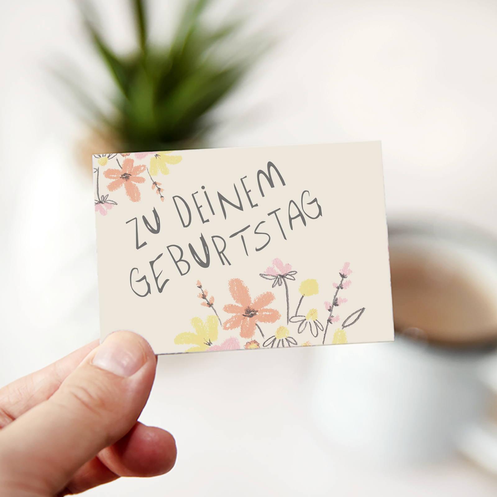 Fröhlich, leicht und voller Charme: Die pastelligen Blumenillustrationen verleihen dieser Geburtstags-Minicard eine besonders herzliche Note. Eine liebevolle Ergänzung zu jedem Geschenk, Blumenstrauß oder als kleines Extra im Briefumschlag.