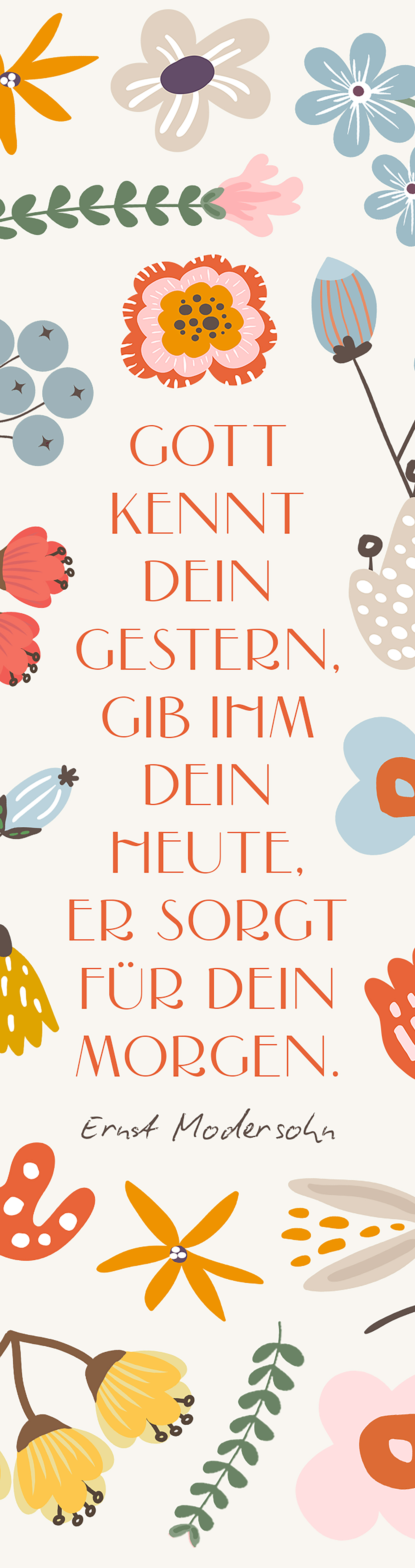 Fröhliche Blumenillustrationen in warmen Farben umrahmen dieses hoffnungsvolle Zitat von Ernst Modersohn. Das Lesezeichen strahlt Leichtigkeit und Zuversicht aus – ein kleines Geschenk mit großer Ermutigung.
