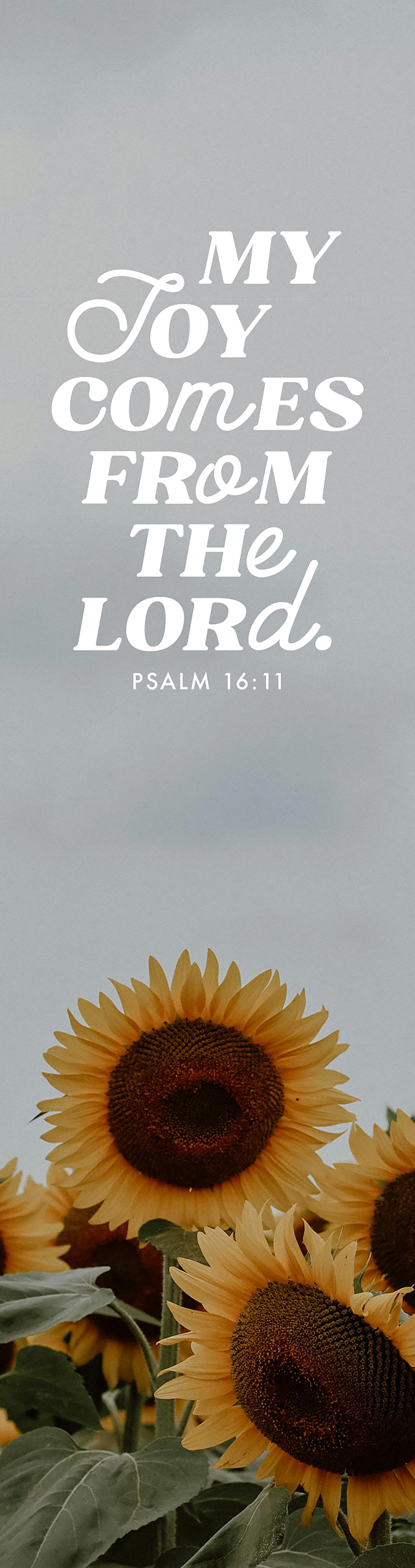 Sonnenblumen und sanfte Naturfarben machen dieses Lesezeichen zu einem strahlenden Ermutiger. Der kraftvolle Vers erinnert daran, wo echte Freude ihren Ursprung hat. Perfekt für Menschen, die Licht und Hoffnung brauchen.