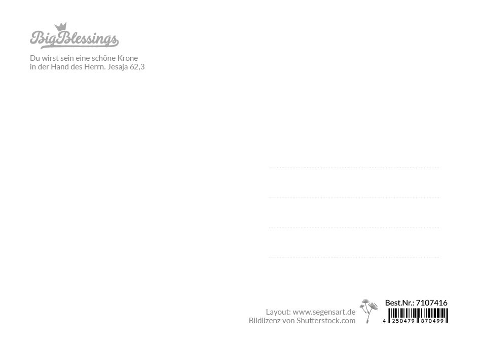 Eine prachtvolle Krone, reich verziert – ein starkes Symbol für Würde und Wert. Die Karte greift die Zusage aus Jesaja 62,3 auf und erinnert daran, wie kostbar jeder Mensch in Gottes Augen ist. Ideal für besondere Momente, Segenswünsche oder als ermutigender Zuspruch.