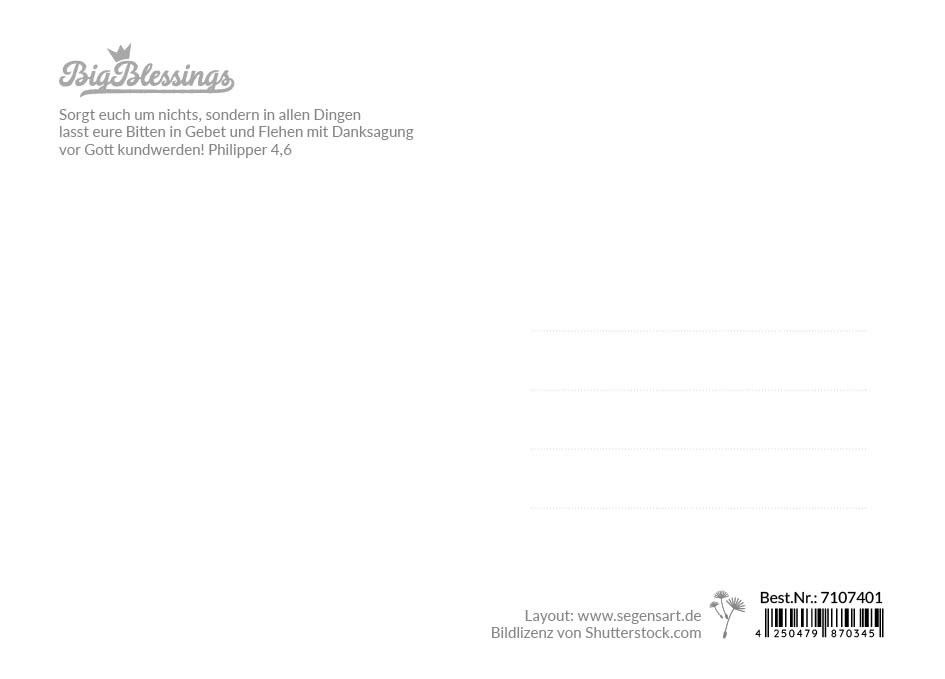 Diese Postkarte bringt Ruhe und Zuversicht in den Alltag. Das sanfte Naturmotiv mit gelben Wildblumen schafft eine warme, friedliche Atmosphäre und trägt die ermutigende biblische Zusage aus Philipper 4,6. Ideal als kleine Aufmerksamkeit oder als starker Mutmacher für besondere Menschen.