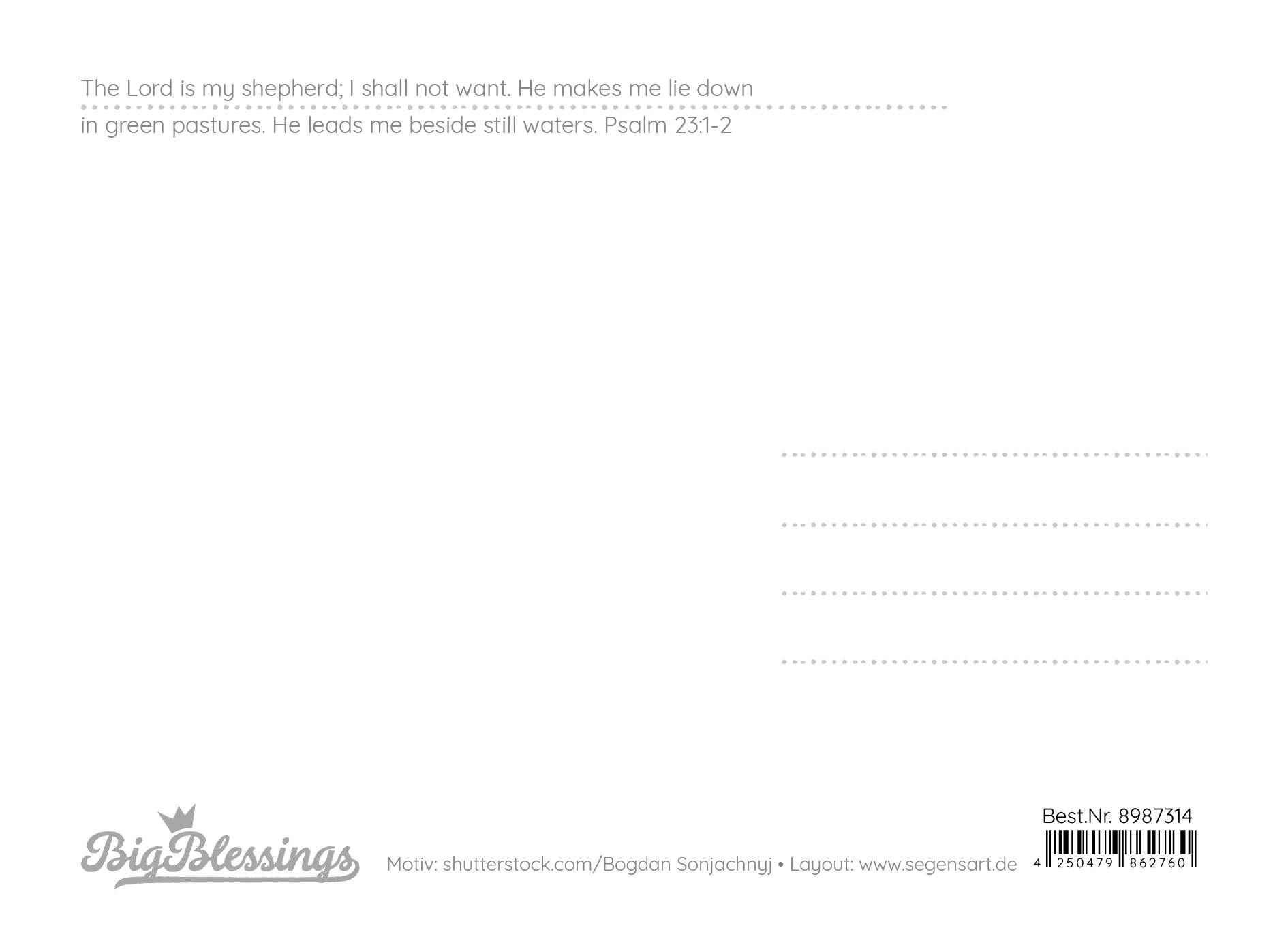 The Lord is my shepherd; I shall not want. He makes me lie down in green pastures. He leads me beside still waters.