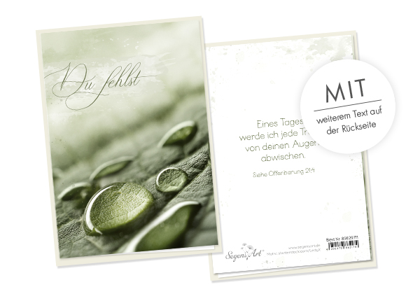 Faltkarte mit farbigem Umschlag und Hülle, im Format 14,8 x 10,5 cm (Format inkl. Umschlag 16 x 11,5 cm)Text:Du fehlst.Rückseite:Eines Tages werde ich jede Träne von deinen Augen abwischen.Siehe Offenbarung 21,4