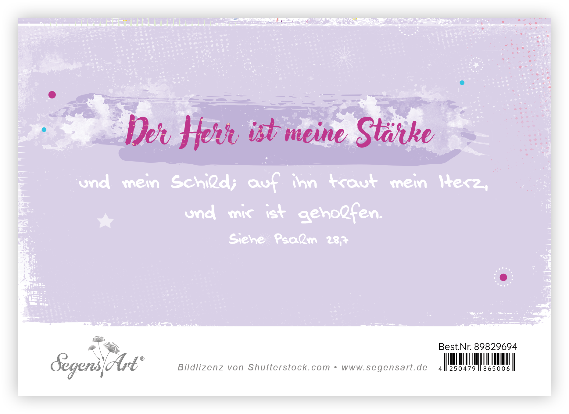 Faltkarte mit farbigem Umschlag und Hülle, im Format 14,8 x 10,5 cm (Format inkl. Umschlag 16 x 11,5 cm)Text:Wir feiern dich!Rückseite:Der Herr ist meine Stärke und mein Schild; auf ihn traut mein Herz, und mir ist geholfen.Psalm 28,7