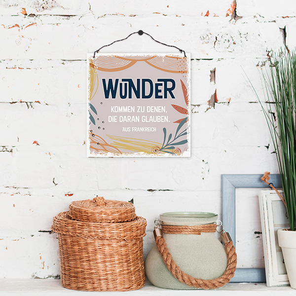 Holzschild im Format 13 x 13 cm, für trockene Innenräume geeignet.Mit doppeltem Draht zum Aufhängen und zusätzlicher Aufstellmöglichkeit - Es wird ein Holzstift mitgeliefert, der einfach auf der Rückseite angebracht werden kann.Handmade - Die Holzschilder werden hier vor Ort von uns produziert.Text:Wunder kommen zu denen, die daran glauben.Aus Frankreich