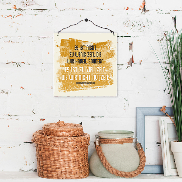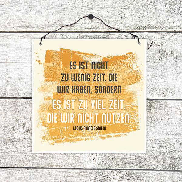 Holzschild im Format 13 x 13 cm, für trockene Innenräume geeignet.Mit doppeltem Draht zum Aufhängen und zusätzlicher Aufstellmöglichkeit - Es wird ein Holzstift mitgeliefert, der einfach auf der Rückseite angebracht werden kann.Handmade - Die Holzschilder werden hier vor Ort von uns produziert.Text:Es ist nicht zu wenig Zeit, die wir haben, sondern es ist zu viel Zeit, die wir nicht nutzen.Lucius Annaeus Seneca