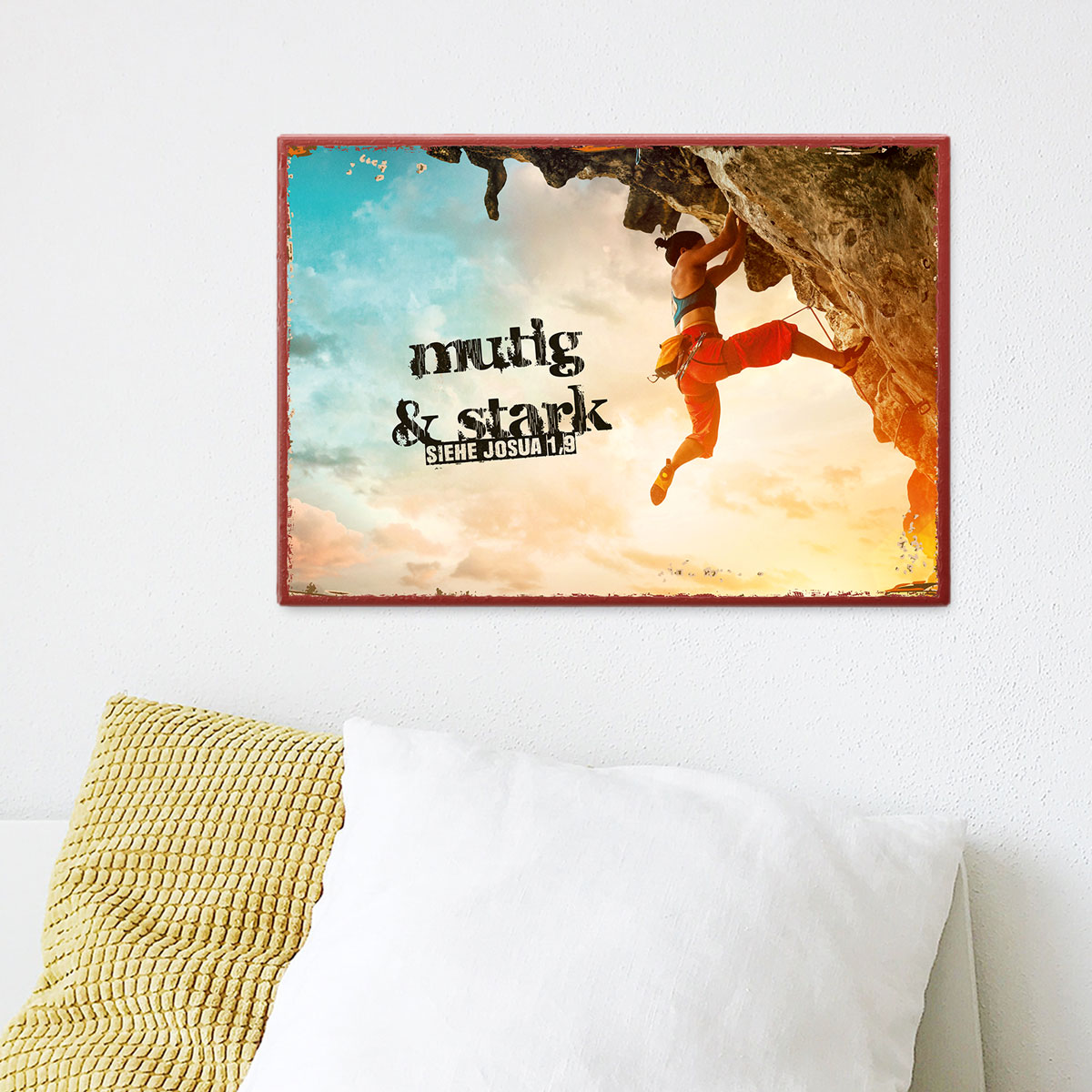 Metallschild im Vintage-Look im Format 27 x 19 cm, für trockene Innenräume geeignet, zum AufhängenHandmade - Die Metallschilder werden hier vor Ort von uns produziert.Text:mutig & stark