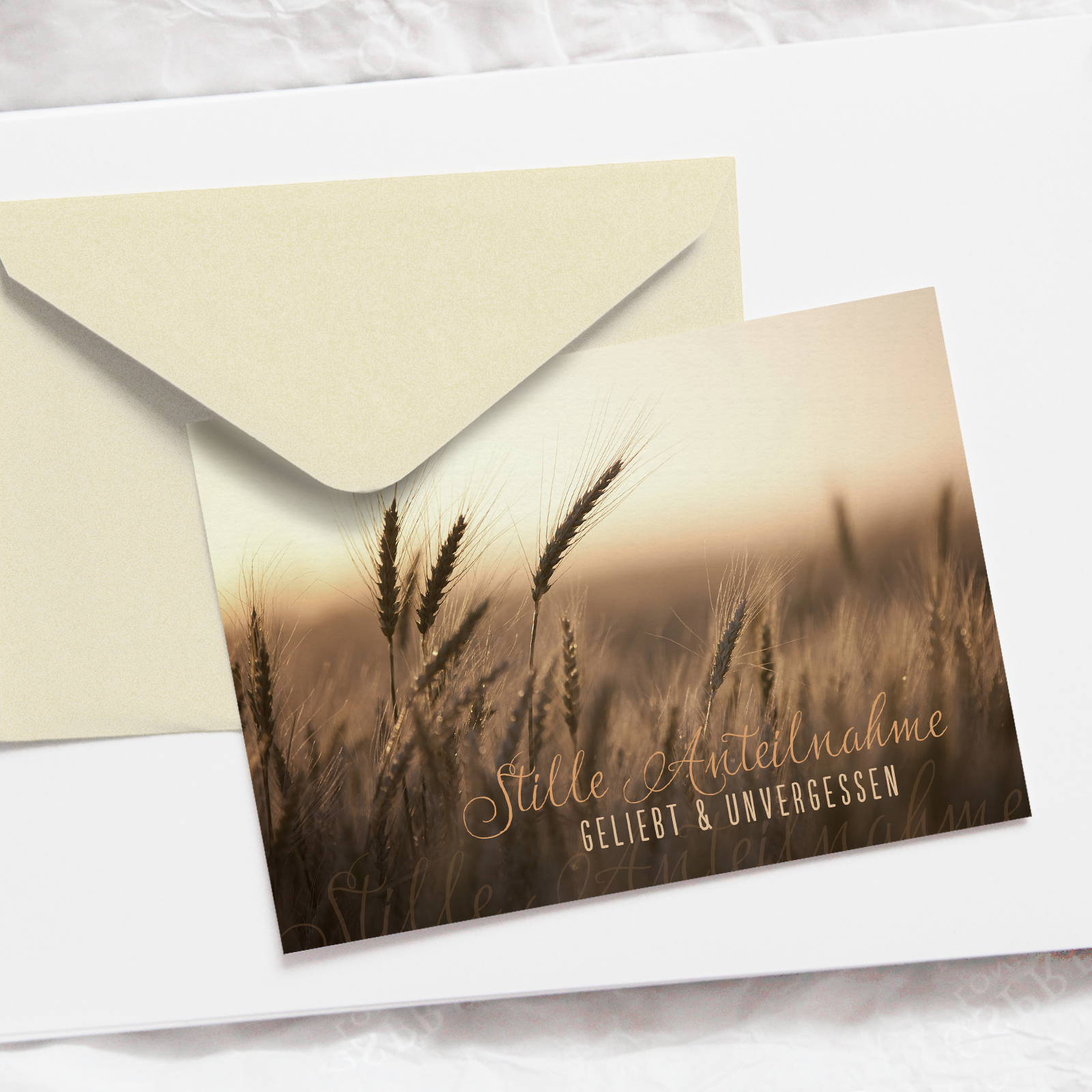 Eine warmtönige, würdevolle Trauerkarte mit reifem Weizenfeld – Symbol für Vollendung und Frieden. Der Zuspruch auf der Rückseite spricht von Gottes Nähe besonders in schweren Zeiten. Eine tröstliche Karte für einfühlsame Beileidsworte.Text: