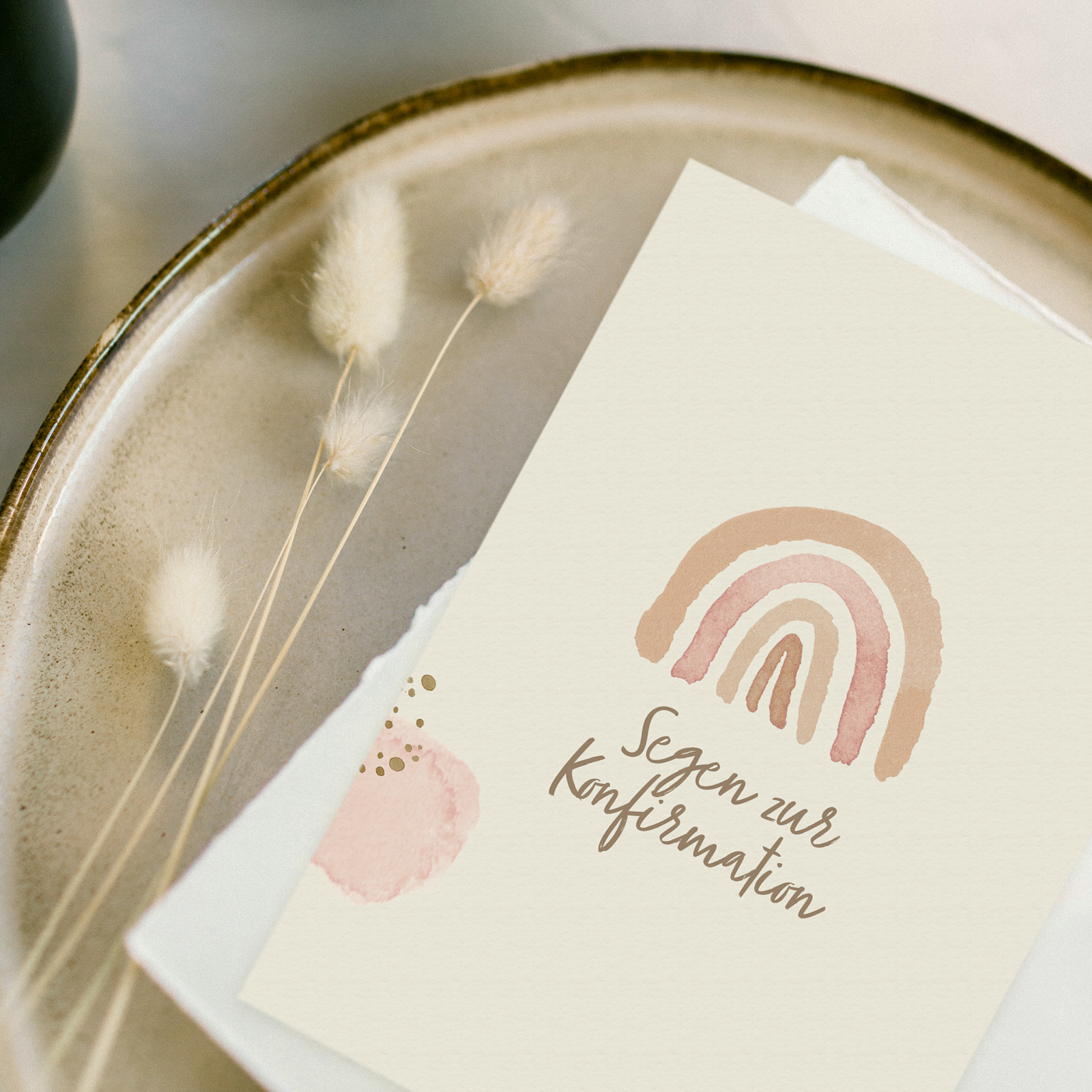 Eine sanft illustrierte Faltkarte in warmen, natürlichen Tönen. Der zarte Aquarell-Regenbogen vermittelt Hoffnung, Schutz und Gottes Nähe – ein liebevoller Begleiter zum besonderen Fest der Konfirmation. Der Vers aus Psalm 139,14 erinnert daran, dass jeder Mensch wunderbar geschaffen ist.Text: