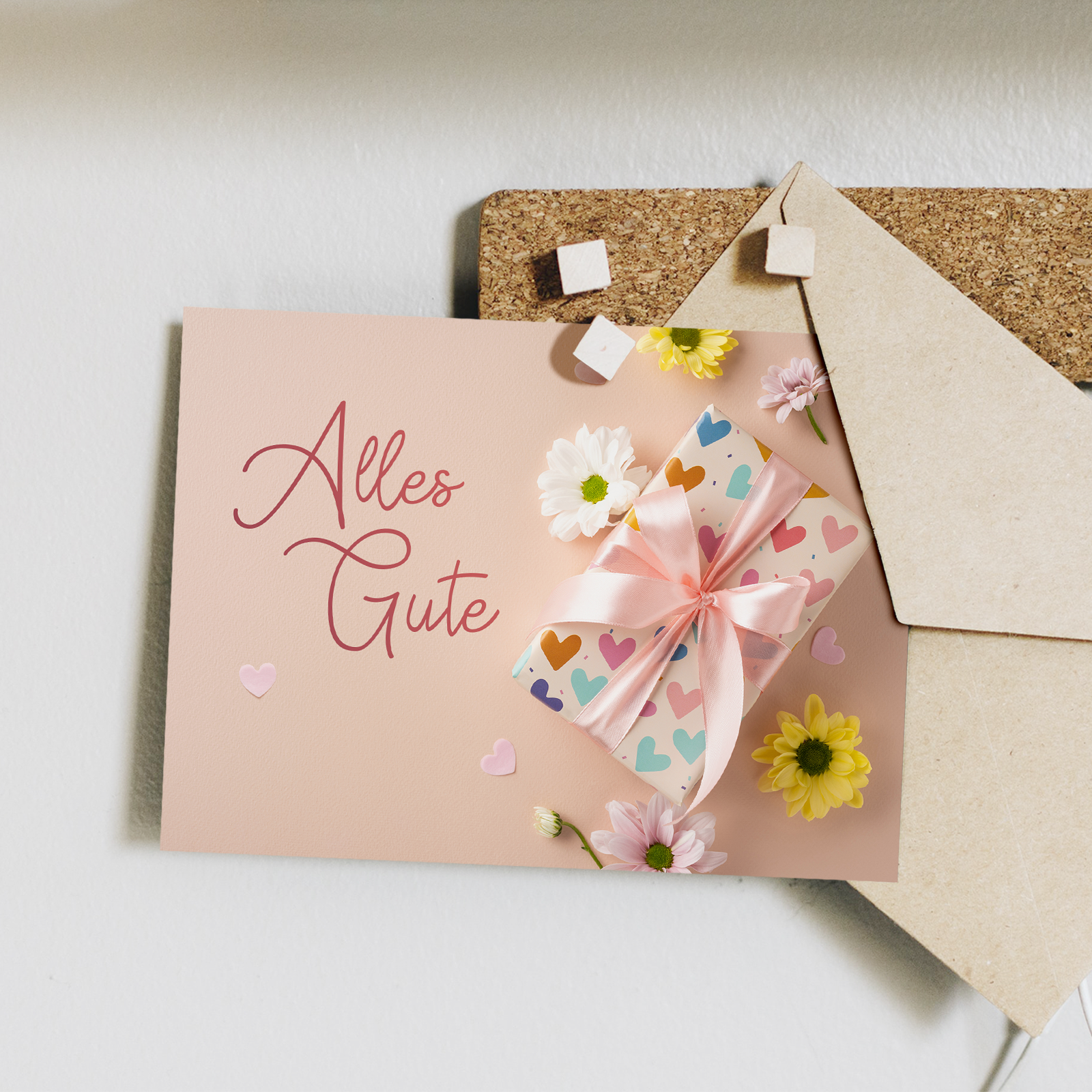 Eine liebevolle Gratulationskarte mit Geschenkpaket, Blumen und weichen Farben. Ideal für Geburtstage oder andere Anlässe, um warmherzige Wünsche zu überbringen.