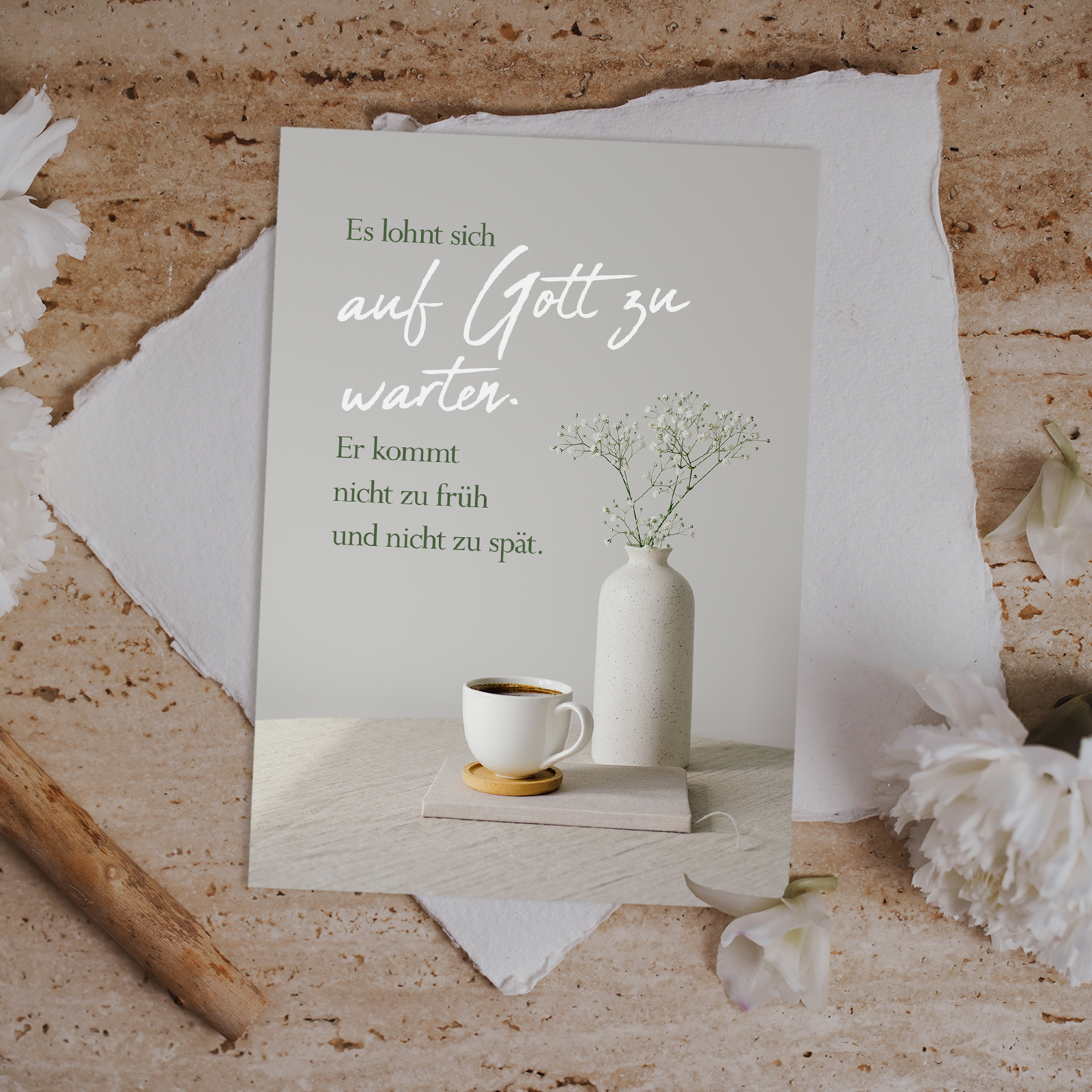 Schlicht, ruhig und stilvoll gestaltet: Diese Postkarte mit Kaffee- und Vasenmotiv vermittelt eine warme Ermutigung, auf Gottes Zeitpunkt zu vertrauen. Perfekt zum Verschenken in Zeiten der Unsicherheit oder als ruhiger Hingucker am Arbeitsplatz.