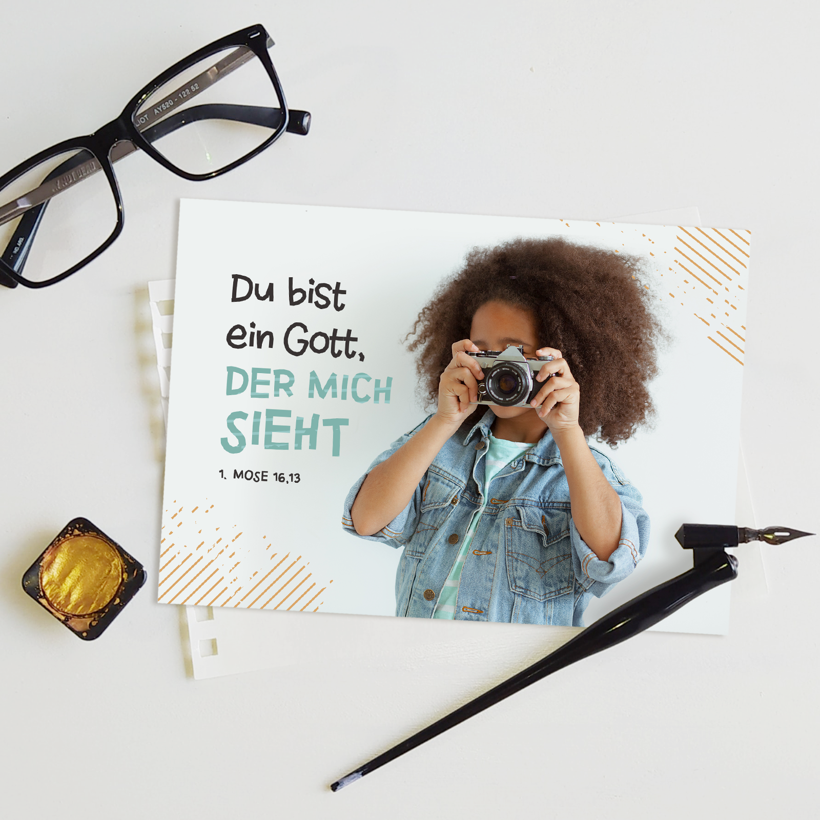 Eine moderne, fröhliche Postkarte mit grafischen Akzenten und einer ermutigenden Zusage aus 1. Mose 16,13. Sie erinnert daran, dass Gott uns sieht und kennt – ideal zum Verschenken oder Weitergeben.