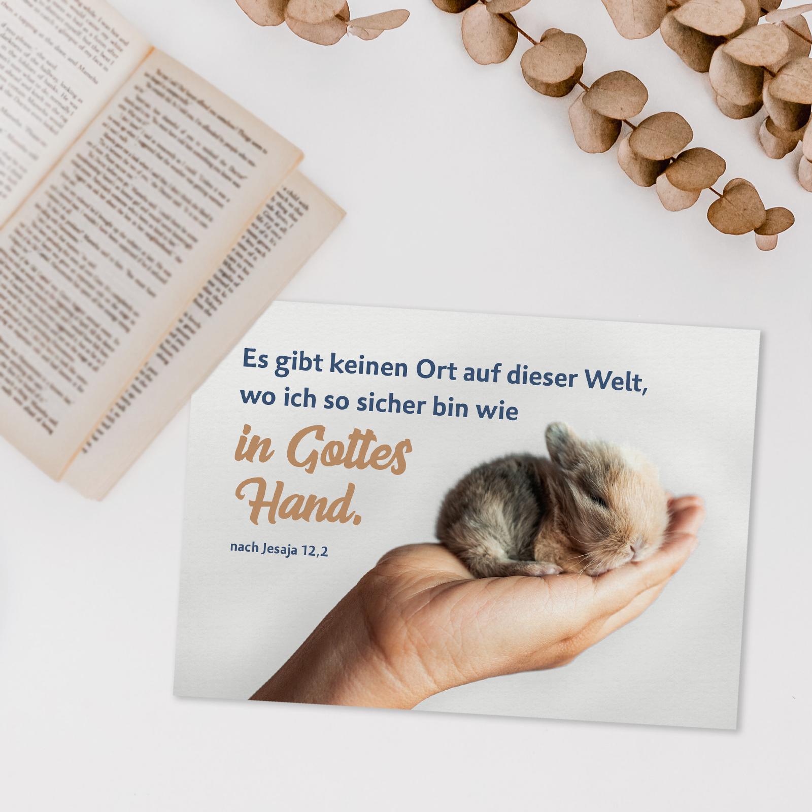 Ein warmes Motiv voller Geborgenheit: Ein kleines Hasenbaby liegt sicher in einer Hand, begleitet von der Zusage aus Jesaja 12,2. Perfekt zur Ermutigung, für Genesungswünsche oder als liebevolle Botschaft zwischendurch.