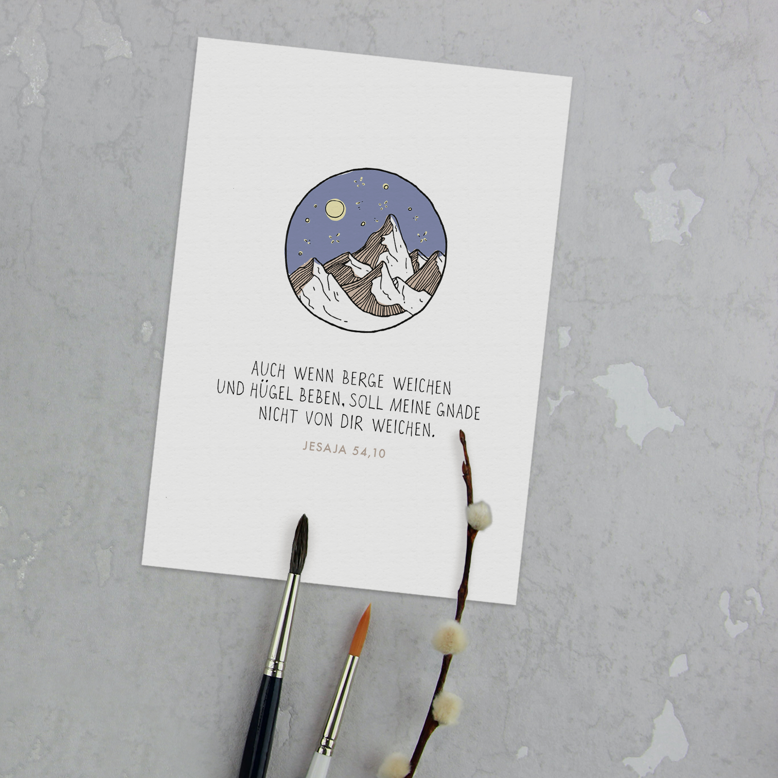 Diese kunstvoll illustrierte Postkarte zeigt eine nächtliche Berglandschaft voller Ruhe und Geborgenheit. Die starke Zusage aus Jesaja 54,10 erinnert daran, dass Gottes Gnade beständig bleibt – selbst wenn alles andere ins Wanken gerät. Ideal zum Verschenken in herausfordernden Zeiten oder als ermutigender Gruß zwischendurch.
