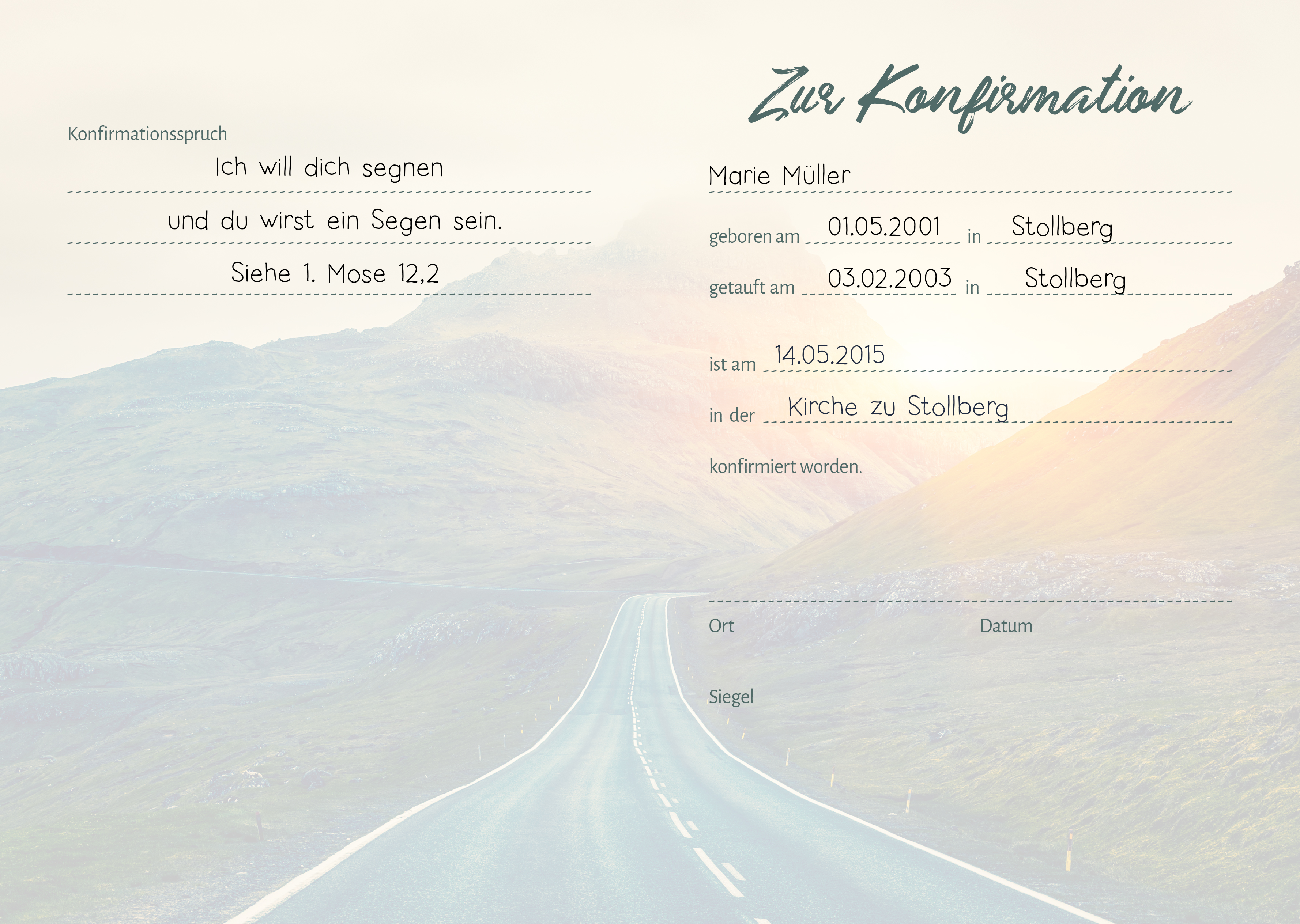 Urkunde – Konfirmation – Straße, Berg-Faltkarte inkl. Inneneindruck (individuell eingedruckt)