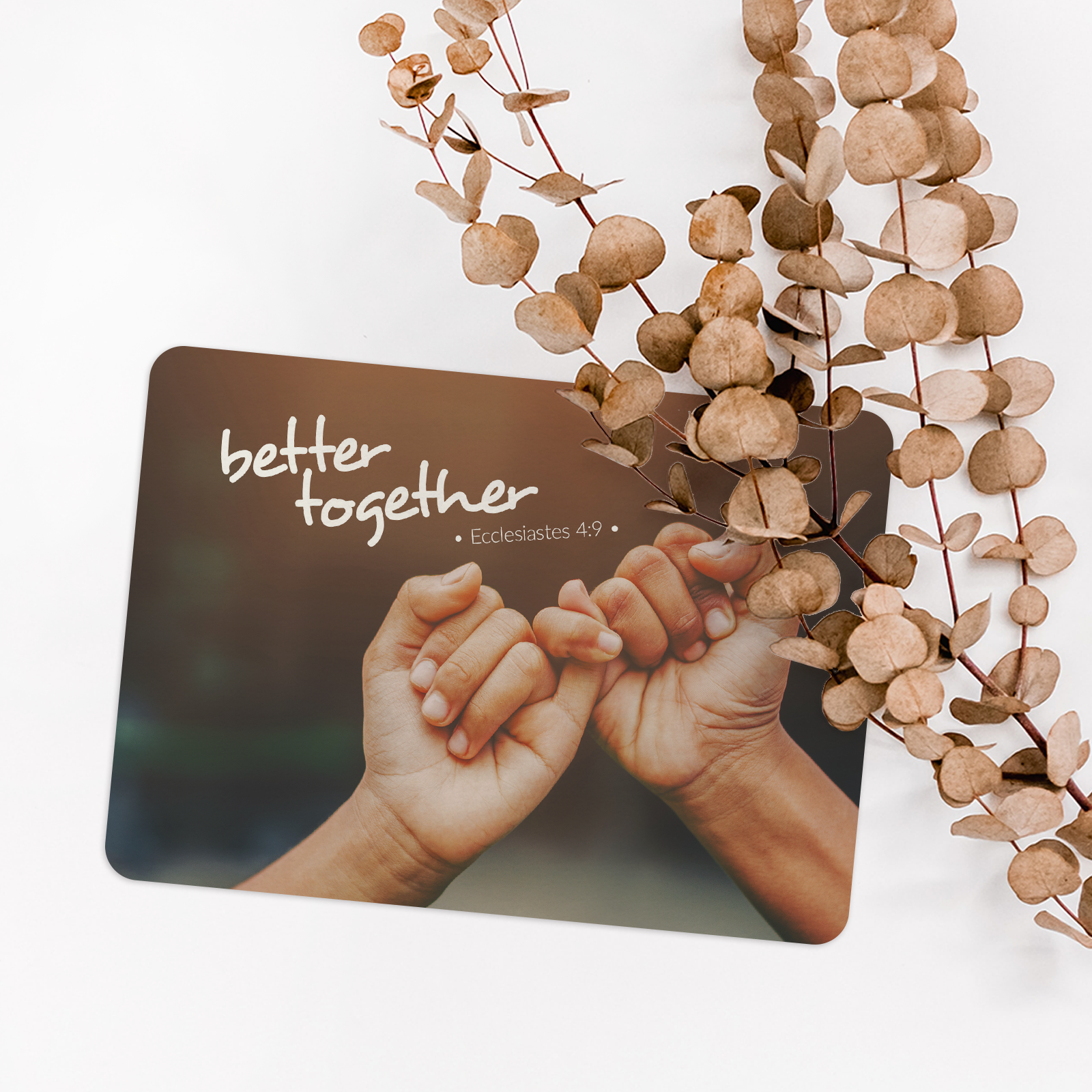 Zwei ineinander gehakte Hände, ein symbolisches Bild für Freundschaft, Zusammenhalt und gegenseitige Unterstützung. Der Bibelvers aus Prediger 4,9 betont, wie wertvoll Gemeinschaft ist. Eine perfekte Karte für Freunde, Teams oder besondere Beziehungen.