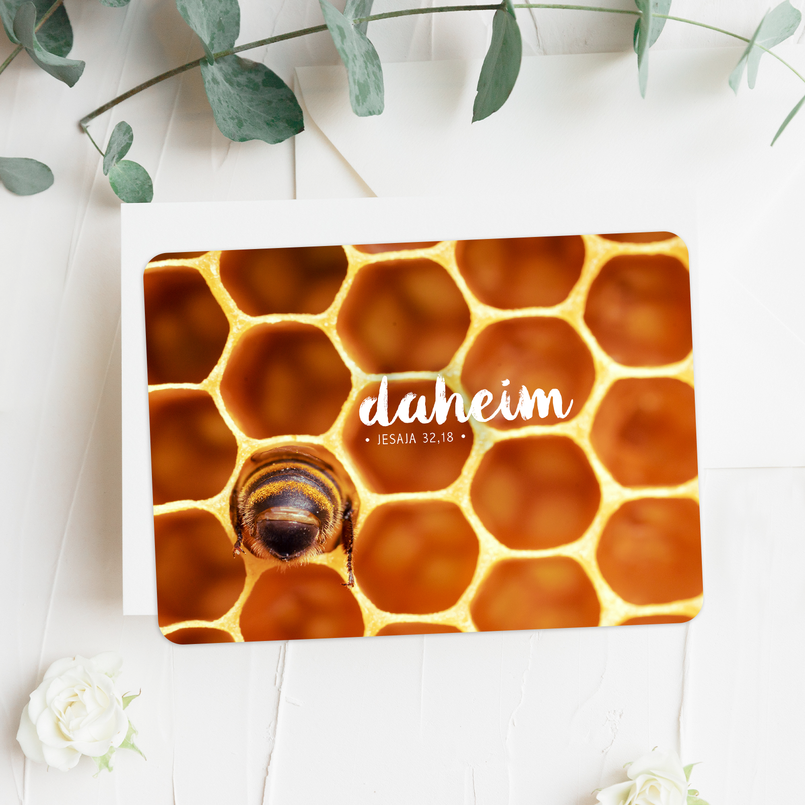 Ein faszinierender Blick in ein Bienenwabenmuster mit einer kleinen Biene – ein warmes, heimisches Motiv. Der Vers aus Jesaja 32,18 spricht von Frieden, Sicherheit und Zuhause-Sein. Eine wunderschöne Karte für Einzug, Ermutigung oder einfach als Herzensgruß.
