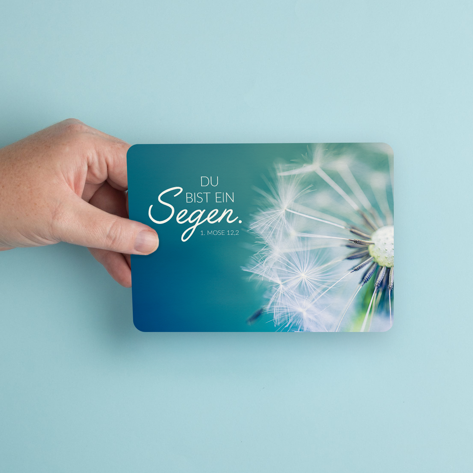 Ein zartes Löwenzahn-Motiv in hellem Licht – voller Hoffnung und Leichtigkeit. Der Bibelvers aus 1. Mose 12,2 ist eine liebevolle Zusage: Manche Menschen sind einfach ein Segen. Perfekt für Freunde, Familie oder ermutigende Grüße.
