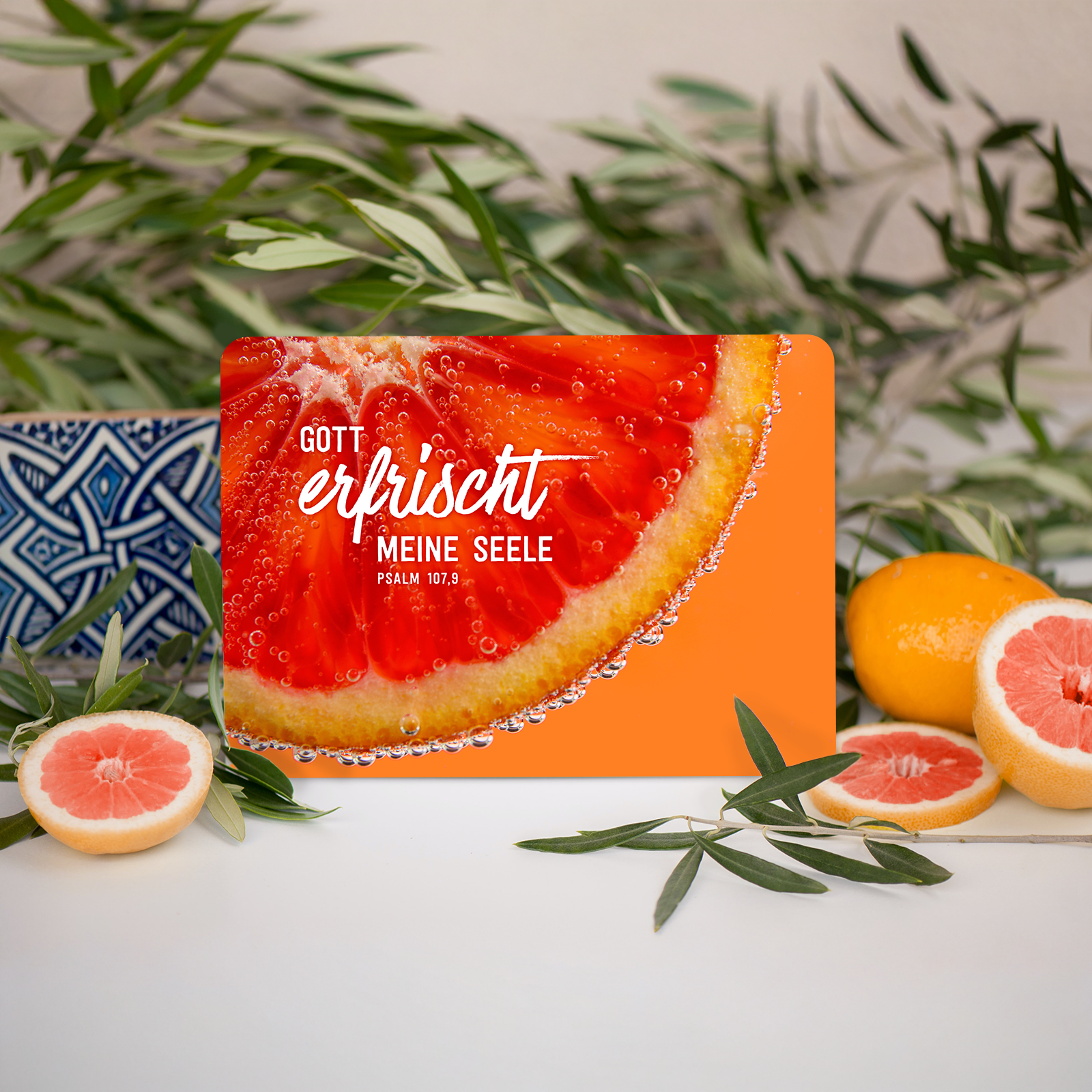 Lebendig und farbintensiv: Die spritzige Orangenscheibe steht für Frische und Kraft. Der Vers aus Psalm 107,9 erinnert daran, dass Gott unsere Seele nährt und belebt. Eine energievolle Karte, die Mut macht und Freude schenkt.