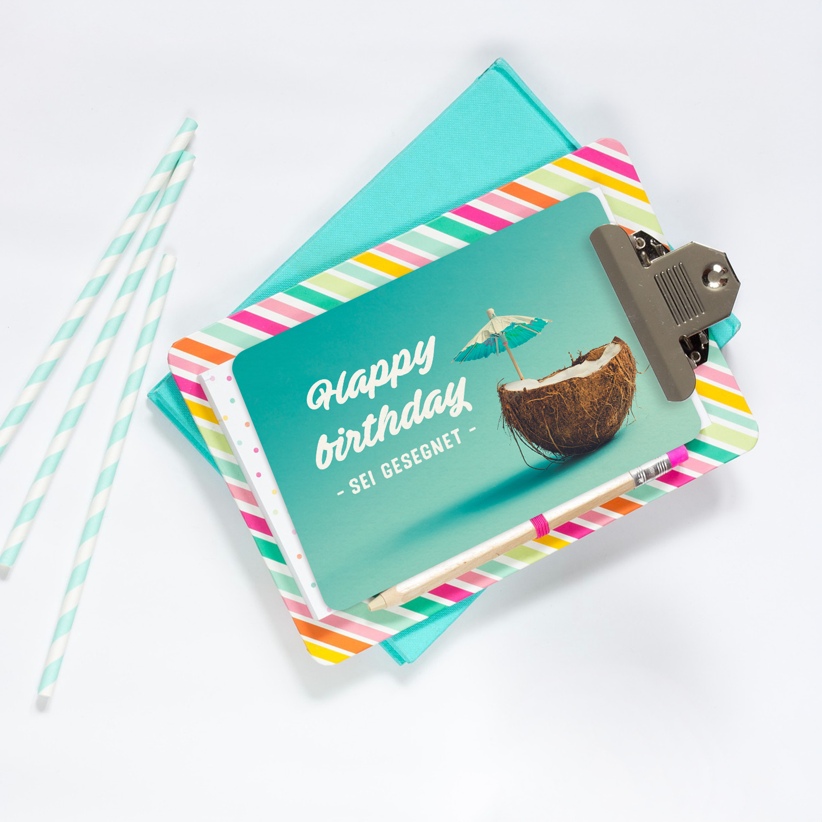 Fröhlich, sommerlich und modern: Die Kokosnuss mit Mini-Sonnenschirm vermittelt Urlaubslaune und Leichtigkeit. Die Karte kombiniert einen frischen Stil mit einem segensreichen Geburtstagsgruß – ideal, um einem lieben Menschen Freude zu bereiten.