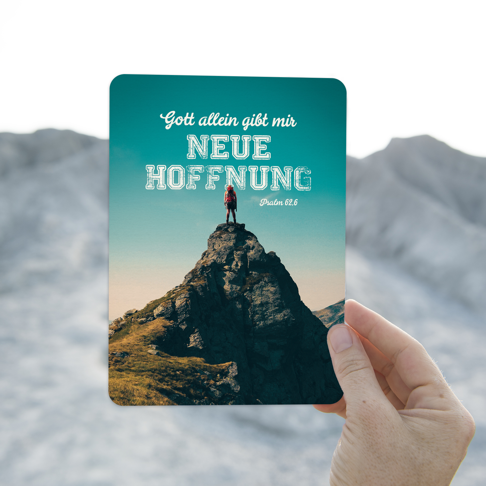 Ein beeindruckendes Bergmotiv symbolisiert Stärke, Standhaftigkeit und Zuversicht. Der Vers aus Psalm 62,6 erinnert daran, dass Hoffnung allein aus Gottes Hand kommt. Diese Karte ist ein idealer ermutigender Gruß für schwere Zeiten oder als inspirierender Geschenkzusatz.