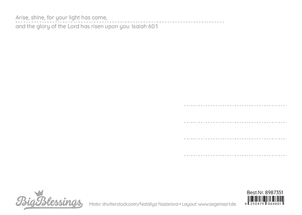 Große XL-Postkarte mit abgerundeten Ecken auf edlem Naturpapier, XL-Format 16 x 11,5 cm.Text:Arise for your light has comemit Text auf der Rückseite:Arise, shine, for your light has come, and the glory of the Lord has risen upon you.
