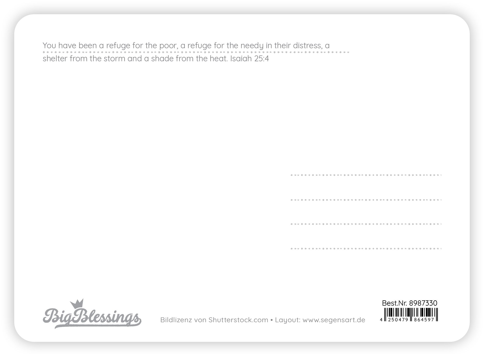 Große XL-Postkarte mit abgerundeten Ecken auf edlem Naturpapier, XL-Format 11,5 x 16 cm.Text:Welcome homemit Text auf der Rückseite:You have been a refuge for the poor, a refuge for the needy in their distress, a shelter from the storm and a shade from the heat. Isaiah 25:4